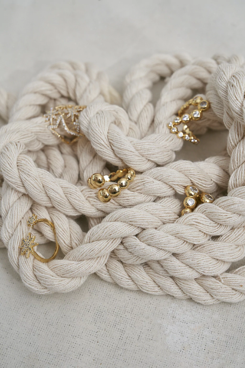 Anillo irregular en bronce bañado en plata 925 con textura de circulos en degrade de tamaños, unos pegados a otros y en sus centros critales incrustados