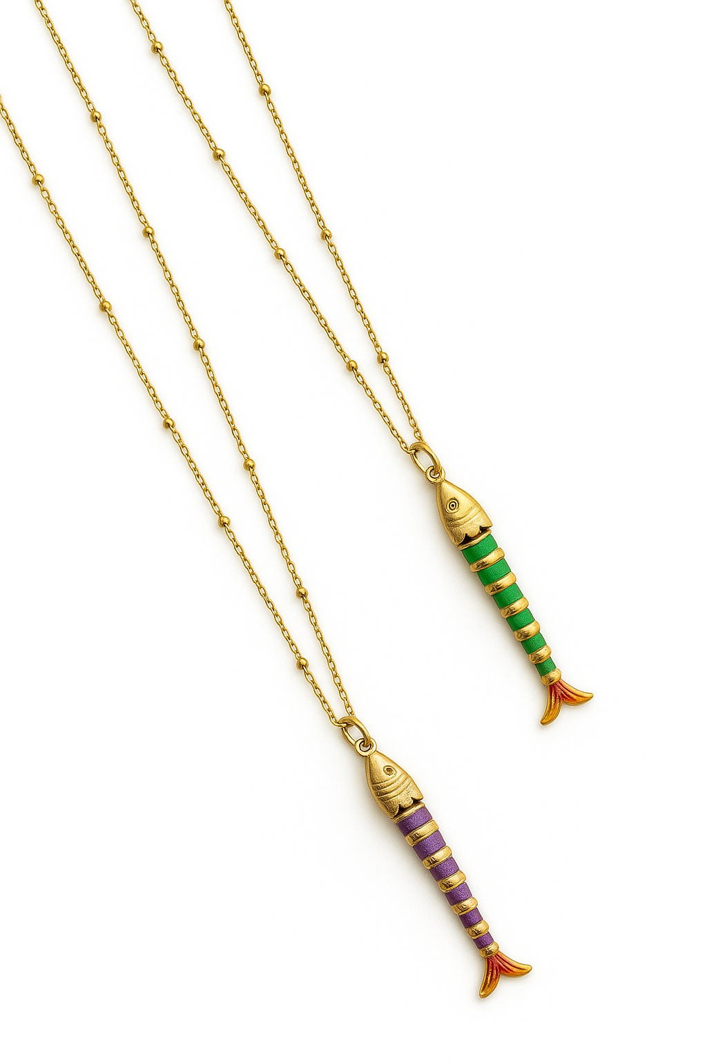 Collar con cadena en bronce y baño en oro 18K con dije de pescado pintado con esmalte y detalles de cristales engarzados